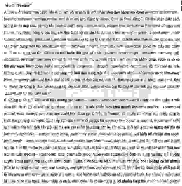 B. Những gì King C. Gillette đi tiên phong (pioneered – initiated, introduced, spearheaded) không chỉ đơn thuần là một cách tiện lợi và giá cả phải chăng để cạo râu, mà còn là một chiến lược kinh doanh (business practice – commercial method, trade strategy, corporate approach) hiện được gọi là “tiếp thị freebie”, đã truyền cảm hứng cho nhiều công ty khác trong những năm qua. Cách tiếp cận của Gillette đi ngược lại (contrary to – opposing, against, inconsistent with) quan niệm phổ biến thời bấy giờ, khi mà một sản phẩm tiêu dùng đơn lẻ, bền vững, chất lượng cao và tương đối đắt đỏ (relatively expensive – comparatively costly, moderately pricey, somewhat high-priced), với biên lợi nhuận cao (high-profit margin – large earnings ratio, substantial markup, significant return), được cho là nền tảng tốt nhất cho một doanh nghiệp. Tiếp thị freebie bao gồm hai nhóm sản phẩm: một sản phẩm chính được mua một lần và một sản phẩm tiêu hao (consumable product – expendable item, perishable good, replaceable commodity) được sử dụng và thay thế thường xuyên. Trong trường hợp này, sản phẩm chính thường được bán với biên lợi nhuận rất thấp hoặc không có lợi nhuận (little to no profit margin – minimal earnings, negligible return, zero revenue) và đôi khi thậm chí được phân phối mà bị lỗ (dispensed at a loss – given away at a deficit, sold below cost, distributed at a financial loss). Tuy nhiên, vì sản phẩm tiêu hao được mua trong nhiều tháng và nhiều năm, điều này có thể mang lại lợi nhuận tổng thể lớn hơn (much greater overall profit – substantially higher revenue, significantly increased earnings, maximized financial gain).>> Form đăng kí giải đề thi thật IELTS 4 kĩ năng kèm bài giải bộ đề 100 đề PART 2 IELTS SPEAKING quý đang thi (update hàng tuần) từ IELTS TUTOR
